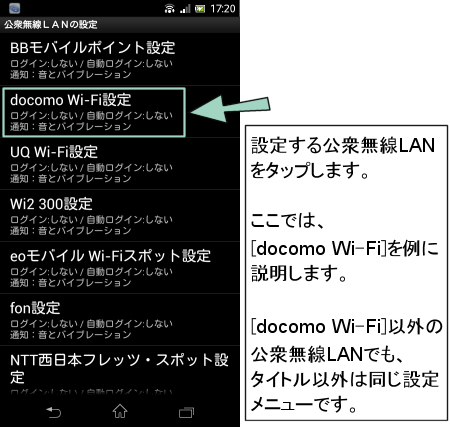 docomo Wi-Fiでは、契約種別を選択すると自動で「-spmode@docomo」や「-mopera@docomo」を付加します。