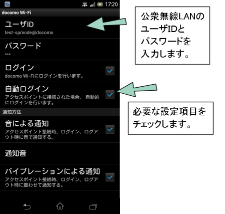 公衆無線LANの自動ログインを行うには、ログインIDとパスワードを設定します。
